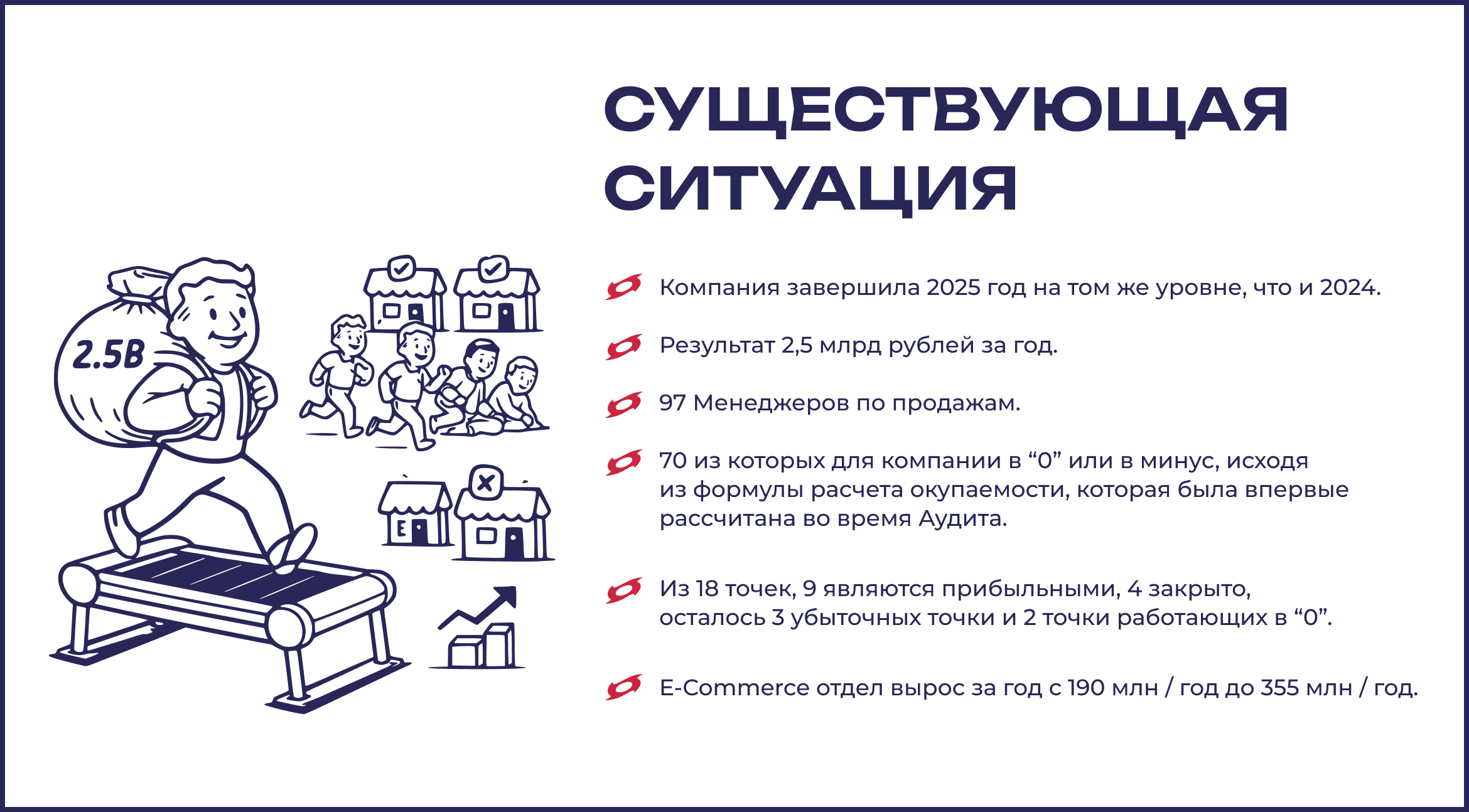 30 менеджеров, 100 колл-менеджеров, 8 операционистов, 5 Рук. Групп Продаж